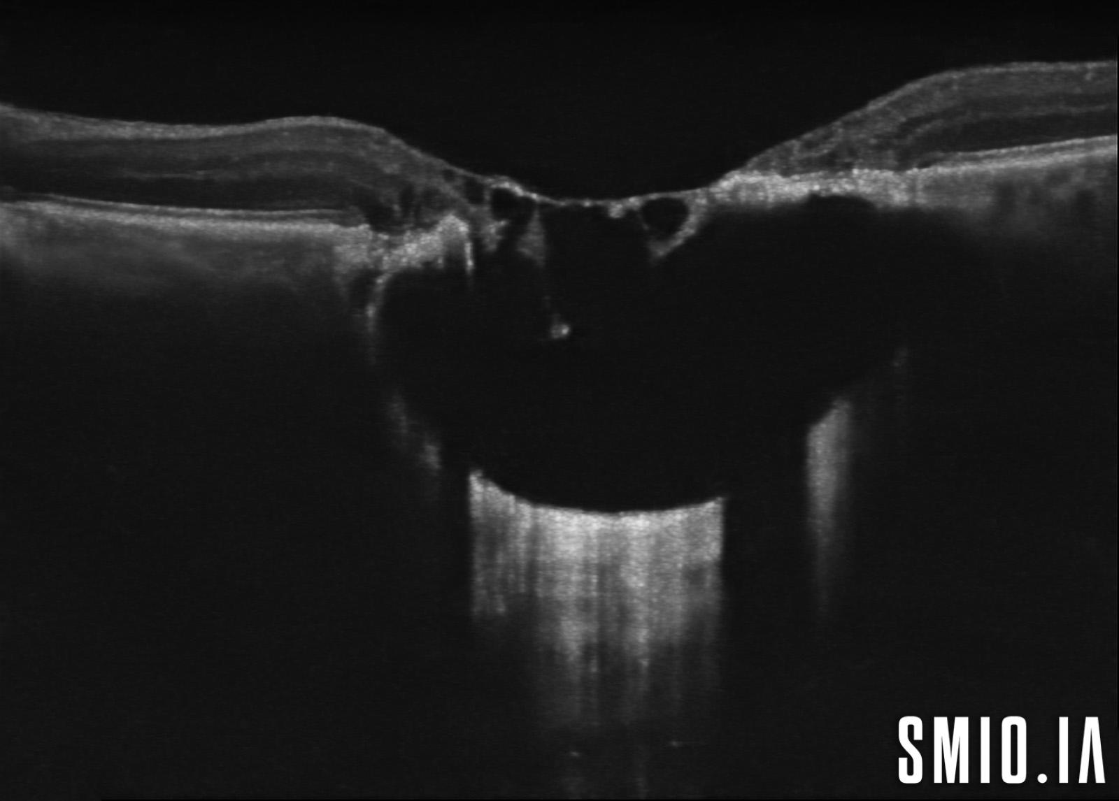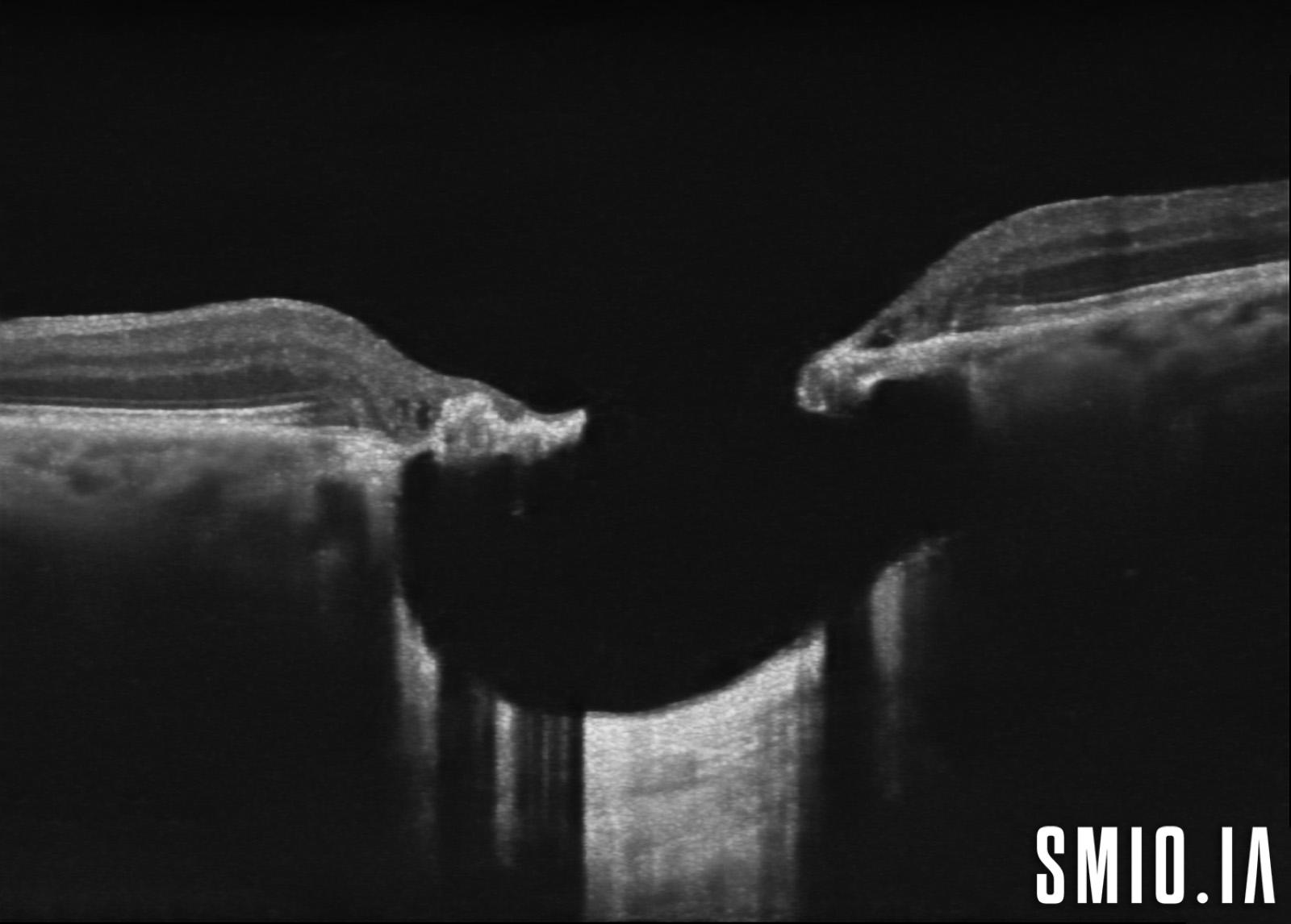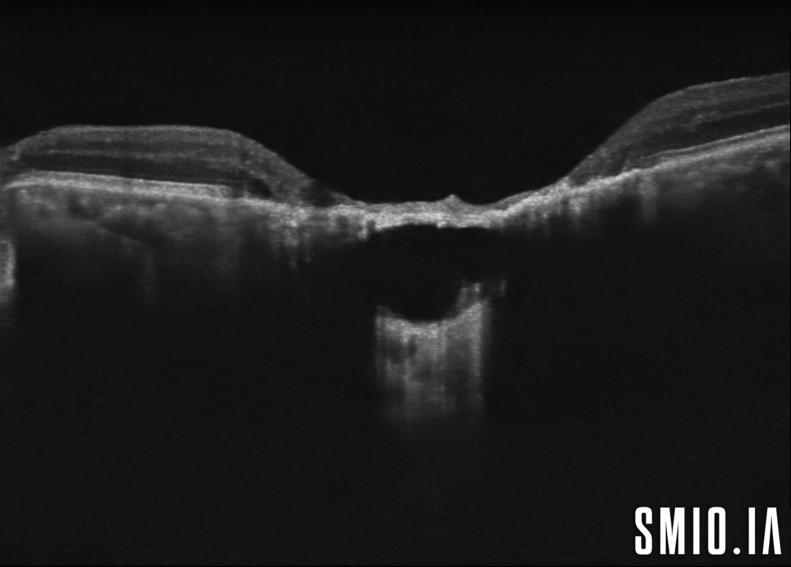 Description: L'image stéréo d'une cicatrice choriorétinienne de toxoplasmose oculaire congénitale avec l'OCT à travers la lésion a démontré une grande lésion choriorétinienne excavée de colobome avec une cavitation intrachoroïdienne