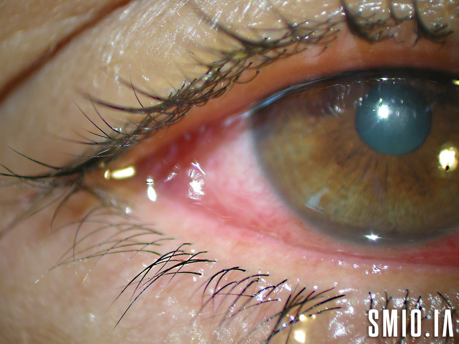 Description: Phase aiguë de la kératoconjonctivite à adénovirus avec conjonctivite folliculaire (en particulier sur la conjonctivae palpéprale inférieure), larmoiment excessif, membranes et oedème palpébral, elle souffrait également d'une adénopathie pré-auriculaire. Egalement connue sous le nom de kératoconjonctivite épidémique, une infection virale oculaire courante et très contagieuse. L'évolution clinique de la KCE doit être divisée en une phase aiguë avec une inflammation conjonctivale d'intensité variable avec ou sans atteinte cornéenne et une phase chronique avec des opacités cornéennes. La KCE est causée par de nombreux sérotypes différents et est très contagieuse pendant la phase aiguë.