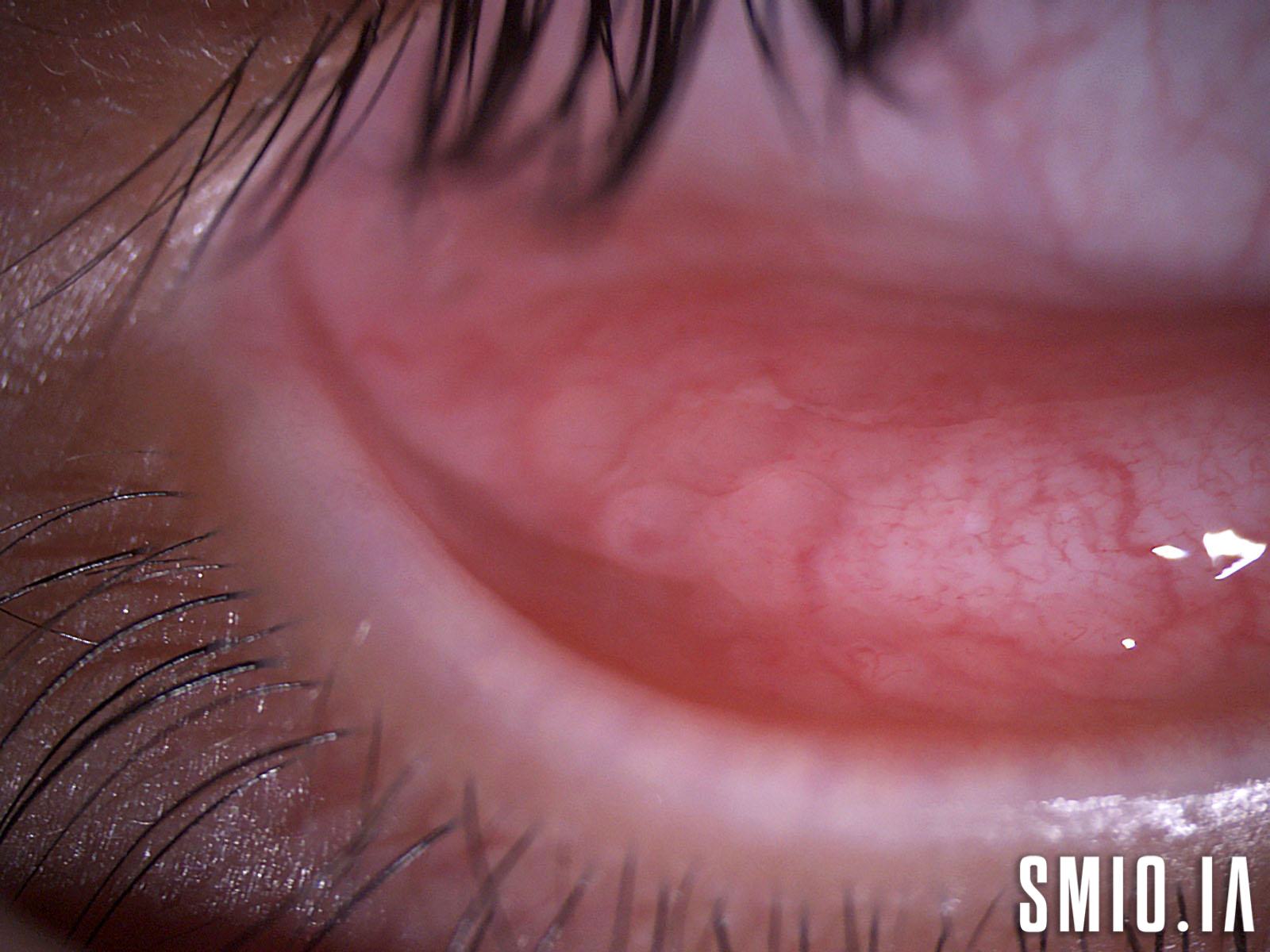 Description: Conjonctivite folliculaire Les follicules conjonctivals sont des collections rondes de lymphocytes, souvent plus proéminentes dans le cul-de-sac inférieur. Les vaisseaux sanguins peuvent recouvrir les follicules, mais ne constituent pas un composant important de ceux-ci. Cela permet de différencier les follicules des papilles conjonctivales.